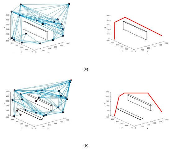 UAV’s path using PRM algorithm in two different scenarios: (a) single static obstacle and (b) multiple obstacles.