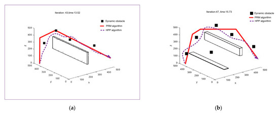 The roadmap acquired through the PRM algorithm in Figure 4 is used as the proposed HPP input. Our simulation is carried out with a varying number of static and dynamic obstacles, and the obtained results are shown in Figure 5. In Figure 5a, we use a static obstacle and four dynamic obstacles. The proposed algorithm finds the way to the target area, avoiding all the obstacles. In Figure 5b, two static obstacles and six dynamic obstacles are used. We consider dynamic obstacles of the same shape and size, which are randomly generated during the simulation. With the increase in the number of static and dynamic obstacles, we can notice that both the number of iterations required and the time taken to reach the goal point increase to some extent. Thus, our proposed algorithm performs well to find the shortest and collision-free path in a dynamic environment with sudden threats and obstacles.