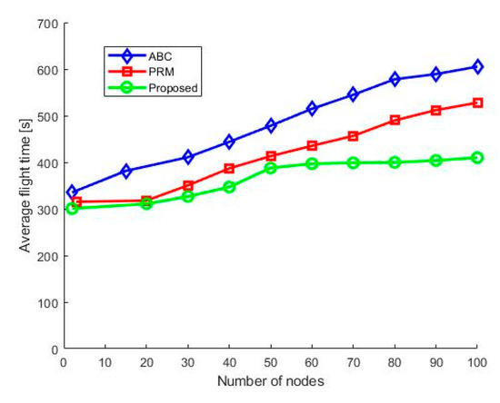 As shown in Figure 6, the average time required by the UAV to encompass the assigned path is calculated. For the simulation, we have focused on the UAV’s time to traverse the WSN deployed area. We have also compared our results with those obtained using the classical PRM and ABC schemes. The results validate that the proposed hybrid method optimizes the UAV’s total flight time for a specified simulation time and condition. The reduction in flight time is due to the optimized UAV height and speed and the proposed algorithm’s high convergence rate.