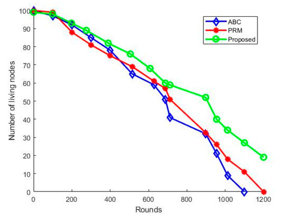 The lifetime of the proposed UWSN is calculated and analyzed for all rounds. The simulation is performed for the specified number of rounds to verify the number of alive nodes. We have considered hybrid MAC and clustering for all three algorithms. The number of live nodes is increased for all three algorithms compared to the conventional PRM and ABC algorithm due to the hybrid MAC and clustering. Figure 7 shows the lifetime of the three path planning algorithms. It is apparent that the number of live nodes is proportionally low for the ABC and PRM schemes. However, for the proposed hybrid scheme, the number of living nodes is higher. This is due to the optimized hybrid path plan algorithm. Furthermore, the CH wake-up schedule is synchronized with the UAV flight time. Using this mechanism, the CH need not remain active for a longer duration, reducing energy consumption. This significantly affects the energy efficiency of the network.