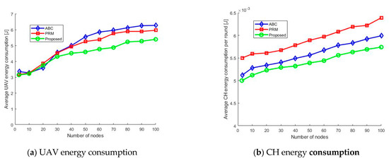 The WSNs and UAVs’ energy consumption remains a design concern, as a reasonably long network lifetime is desirable. The average energy consumption of the UAV and SNs are calculated and analyzed, as shown in Figure 8. We have compared the obtained results using the energy consumption of the PRM and ABC algorithms. From the results shown in Figure 8a, it is apparent that the energy usage of the UAV decreased when using the proposed hybrid path planning method. We have focused on the energy consumption of the UAV during its flight and communication with the SNs. Minimization in energy consumption is possible owing to the optimization process and reduced flight time, as shown in Figure 6.