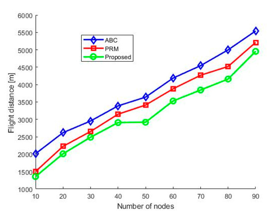 Figure 9 shows the total distance traveled by the UAV to encompass the sensor deployed region. The results show that the proposed method’s distance is minimal for the three simulated methods. The reduction in flight path is because the HPP uses the shortest path provided by the PRM unless it encounters a collision and obtains an optimized path provided by the ABC to manage the complex environment’s different constraints. Initially, the PRM path planning performs well; however, it cannot handle the dynamic obstacles, and the height and speed are not optimized. We aim to minimize the flight distance to complete the mission quickly to lessen the damage in emergencies.