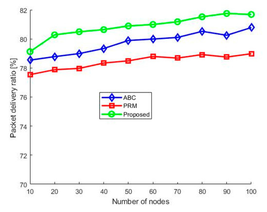 Figure 10 shows the PDRs of the PRM, ABC, and the proposed algorithm. According to the results, the proposed algorithm’s PDR remains higher than 80% after the UAV entered the WSN region. The change in packet loss from the proposed method is minimal due to the speed and height adaptation during the data collection time. Additionally, UAV hovers when data collection is not completed. The proposed method is then compared with the PRM and ABC algorithms. From the comparison, we can conclude that the number of packets received from the proposed algorithm is higher than those from the PRM and ABC algorithms. The PRM shows the lowest packet delivery rate because it does not function appropriately in complex environments and adapt in accordance with the constraints.