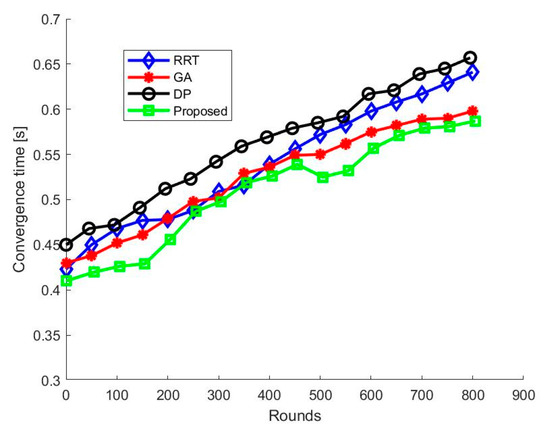 We used the optimized ABC algorithm for the local path plan because of its fast convergence capacity. We evaluated the convergence time of the ABC algorithm and compared it with other widely used path planning algorithms (i.e., RRT, GA, and DP) in Figure 11. We used the same network configuration for all the algorithms used in the comparison. Based on the obtained results, it is apparent that the convergence time of HPP is the shortest for almost all the rounds. In our proposed HPP algorithm, the classical ABC algorithm is modified by optimizing various constraints. As a result, the proposed algorithm offers a faster convergence speed than the other three popular algorithms.
