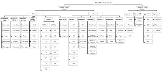 In this paper, we study the popular international ED triage systems that were widespread, adopted based on the claim of a systematic review published in 2019 [35]. We also review other proposed ED triage systems found in the literature for classifying patients considering improving the ED’s triage process, including reducing waiting times, digitizing, and conducting the triage remotely, the literature will be reviewed in the range from 2016 to 2021 with snowballing to collect any relevant study. Exploring such studies could help define the capabilities of these systems to manage COVID-19 cases as well as investigate the possibility of adapting these systems to COVID-19 conditions. Moreover, we review the methods proposed and announced in the literature, since the beginning of the COVID-19 epidemic, to classify COVID-19 patients in EDs around the world. We study and classify the symptoms that are relied on to classify COVID-19 patients. We also provide a comprehensive taxonomy shows all the triage approaches reviewed in this paper.
