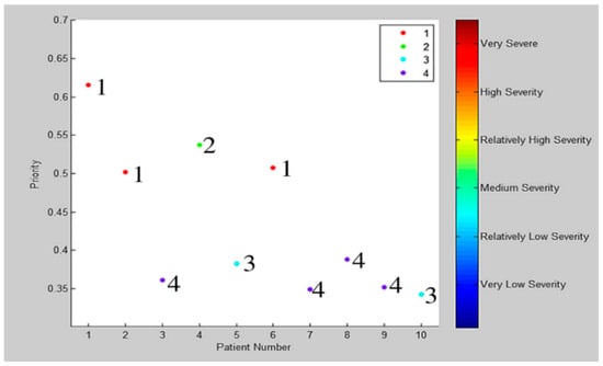 Alternatively, the authors in [45] improved the triage process by applying the group technology concept to develop a dynamic grouping and prioritization (DGP) algorithm. They have considered several measures of system performance, such as length of stay (LOS), time-to-bed (TTB), time in ED, throughput, percentage of late patients, and the risk of delaying patients. Patients are categorized into eight types based on their age, group, and priority. Patients will be prioritized in groups from 1 to 10 as shown in Figure 3.