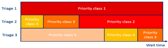 Furthermore, the authors in [49] analyzed the patient-routing behaviors of four ED decision-makers who were applying the CTAS. They estimated the cost of waiting for ED patients as recognized by the decision-makers, then derived policy implications, and made suggestions to enhance triage systems. They suggested considering risk factors and the level of congestion in ED when determining the patients’ waiting time. They also found that physicians are better suited to perform triage and prioritization tasks than the ED administrator/chief nurse, as this would improve certain metrics for operational performance such as waiting time. Furthermore, they suggested studying the possibility to enhance the CTAS by considering the delay-dependent priority rule, wherein Figure 4, they provided an example of the rule’s guidelines; the priority class is classified by the triage level and waiting time, and equal-priority patients are grouped into one priority class represented by the same color.