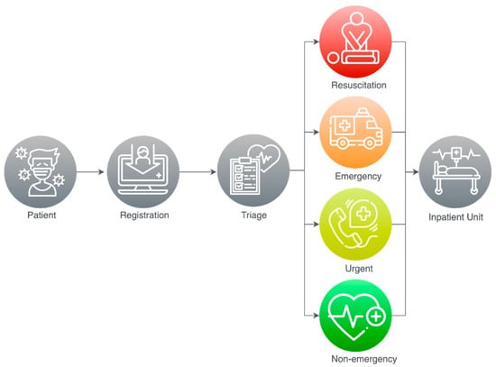 Authors in [61] provided guidelines for patients and healthcare personnel to support controlling the spread of COVID-19. The authors designed principles to enhance the ED’s triage system used by a triage nurse to classify the patients into five levels, as shown in Figure 1, depending on the “Emergency Severity Index” (ESI) triage method.
