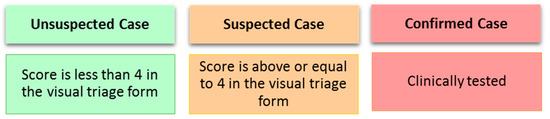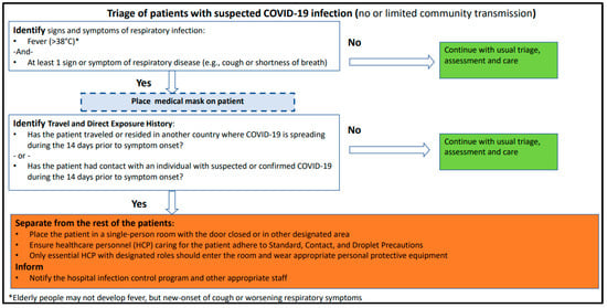 The Centers for Disease Control and Prevention (CDC) published a report [60] to help health workers protect themselves during patients triage process and gives guidelines for patients such as when they need to go to the healthcare facility, how they should inform healthcare providers if they suffer from any respiratory symptoms, wear face masks, clean their hands with water and soap, and preserve enough social distance over one meter. Several guidelines were proposed for protecting both patients and healthcare workers including communicating with patients ahead before they arrive to healthcare facility and set up of triage area for suspected cases. Moreover, they presented Triage Protocol for countries holding limited community transmission or even no community transmission as shown in Figure 6.