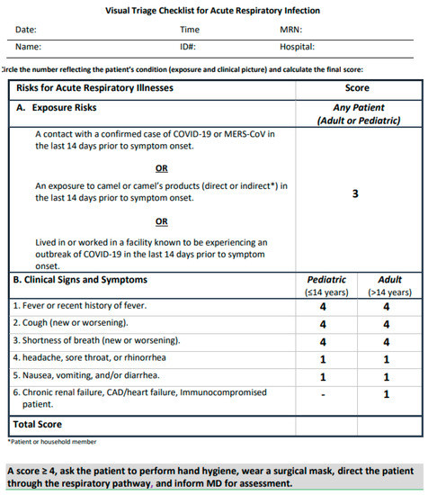 - CDC Standard Operating Procedure (SOP) for Triage of Suspected COVID-19 Patients in non-US Healthcare Settings: Early Identi cation and Prevention of Transmission during Triage. Available online: https://www.cdc.gov/coronavirus/2019-ncov/hcp/non-us-settings/sop-triage-prevent-transmission.html (accessed on 1 June 2020).