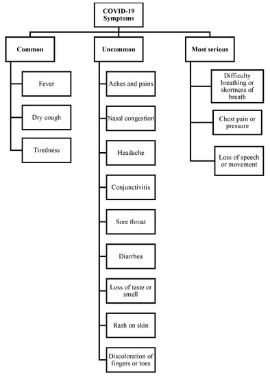 At the time of writing this paper, there are still high variations in reports on symptoms that could possibly identify COVID-19 cases. However, according to WHO [66], fever, dry cough, and tiredness are highly common symptoms in COVID-19 patients. Less common symptoms have been reported by the CDC [60] such as aches, headache, nasal congestion, conjunctivitis, diarrhea, sore throat, loss of smell or taste, skin rash, and discoloration of fingers or toes. Difficulty in breathing, chest pain, loss of speech, and difficulties in movement are the most critical symptoms that need urgent medical intervention and care [8].
