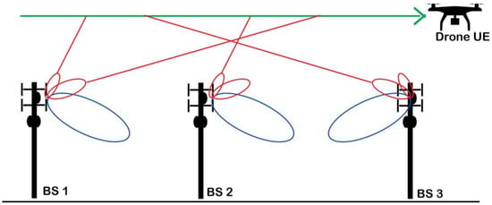 Figure 1 illustrates a scenario when a low altitude small drone flies above the terrestrial base stations (BSs). Due to the high probability of line-of-sight (LoS) link in higher altitudes, drone communications suffer from both uplink and downlink interferences []. Moreover, terrestrial network planning is optimized for ground UEs, and BS antennas are tilted downwards to prevent inter-cell interference and provide service for ground UEs via antennas’ main lobes []. Meanwhile, drones that fly above the BSs are served by the antennas’ sidelobes, which cause severe challenges for interference and mobility management [].