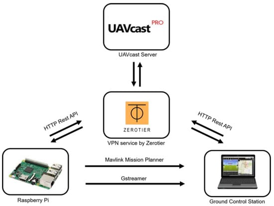 In this article, a cloud-based operational system was implemented and a cloud server service from UAVmatrix, known as UAVcast [], was used. As shown in Figure 3, the drone and the ground station are connected to a virtual private network (VPN) provided by Zerotier to obtain a static IP address. With some configuration, both UEs are connected to the UAVcast cloud server using LTE mobile network. The drone will send its telemetry data and live stream video to the server, then accessed by the ground station, and vice versa. Both UEs are connected via LTE mobile network.