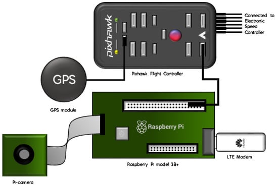 As illustrated in Figure 4, the hardware used in this research consists of a Raspberry Pi model B+, a Pi camera from Raspberry Pi, an FC from Pixhawk, a Huawei E3372 LTE modem, and a GPS module. The function of Pixhawk FC is to control the drone’s movement, assisted with a GPS module to obtain the drone’s location. CC data from the ground station is handed to FC over the Raspberry Pi, which is equipped with an active internet plan from a local network provider. To complement the standard drone operation requirement, a camera was equipped at the Raspberry Pi to stream live video footage to the ground station.
