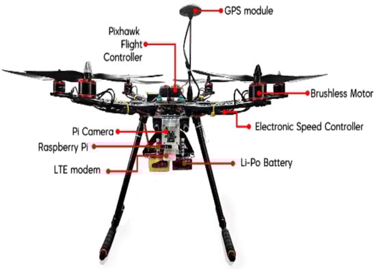 Furthermore, the FC is connected to the Electronic Speed Controller (ESC), which adjoins the drone’s brushless motor. Each of the drone components is interconnected, powered by a lithium-ion polymer (Li-Po) battery. Figure 5 shows the developed LTE-powered drone prototype.
