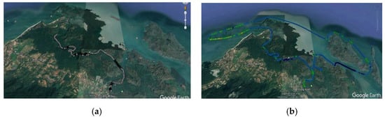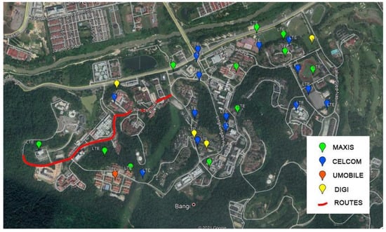 A 1.6 km route located at the National University of Malaysia (UKM) was chosen as the research area. The campus can be considered as a sub-urban metropolitan area with a geographic terrain of undulating hills. It is fully covered with an excellent mobile network infrastructure. The locations of available eNodeB towers were extracted from some open-based websites such as www.cellmapper.net (accessed on 20 May 2019) [] and www.opencellid.org (accessed on 20 May 2019) []. The tower locations were then plotted into the map provided by Google Earth Pro software. Figure 6 shows the research area considered.