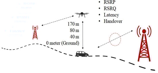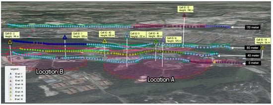 Figure 8 illustrates the concept of the drive test conducted. The measurement results were collected in a commercial LTE network with a carrier frequency of 2.6 GHz and a system bandwidth of 20 MHz. The drive test was conducted in two steps, first, at ground level and second, at higher altitudes. To do so, a Huawei STK-L22 smartphone with the preinstalled G-net Track Pro application was used. Once the application started to record, it was carried along while driving a car for the entire planned route to record the data needed to evaluate the network performance at ground level. The phone was placed inside a car without any external antenna and only powered by its own battery. Since the GNet Track Pro application’s reliability has been tested before, just a single test was conducted for each track. This test was repeated four times by using the Subscriber Identity Module (SIM) card of four different telecommunication service providers that are widely available in Malaysia: Maxis, Umobile, Celcom, and Digi. During the test, the car speed maintained at a speed around 30 km/h. The ground level measurement was performed as the benchmark. Next, higher altitude drive tests were conducted at three different altitudes: 40 m, 80 m, and 170 m on average. The height of 170 m was chosen to investigate the impact of serving drones by the sidelobes of BSs’ antennas. The intermediate height of 80 m was selected because that is close to the BS antenna height in suburban areas. Finally, the height of 40 m was considered since that is the most commonly used flying altitude for many drone applications, such as survey, inspection, and monitoring, and the drones are more likely to be served by the main lobes of BSs’ antenna. For the aerial drive test, the smartphone was attached to the developed hexacopter drone and the drone flew within the same routes as the car with an average speed of 35 km/h.