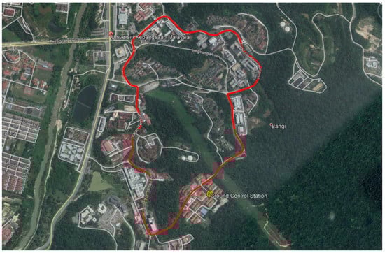 Since the network quality is still uncertain, the test was conducted at ground level. The Ground Control Station (GCS) was located at a specific place with good network quality, and the drone was brought inside a car traveling around the UKM campus. The waypoints are as shown in Figure 9. Since there is no suitable method to measure detail parameters to test the performance, this test aimed only to measure the throughput and delay experienced by the drone and the GCS. The car speed was maintained at around 45 km/h during the test. The route is around 4.2 km, and the farthest point between the drone and the GCS is about 1.2 km.