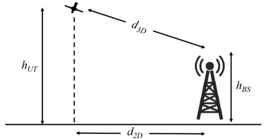 For modeling the path loss between drone and BS, information such BS height, , drone height, 2D and 3D distances, as shown in Figure 10, are need to be known. From the 3GPP [] the path loss model for aerial UEs is given as: