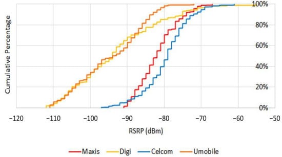 Figure 11 shows the drive test results in terms of cumulative percent of RSRP. As results show, Maxis provides the most reliable coverage, wherein 90% of the time, RSRP is above −75 dBm and in 100% it lies above −90 dBm.