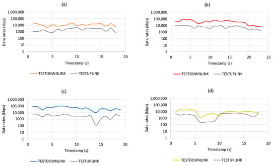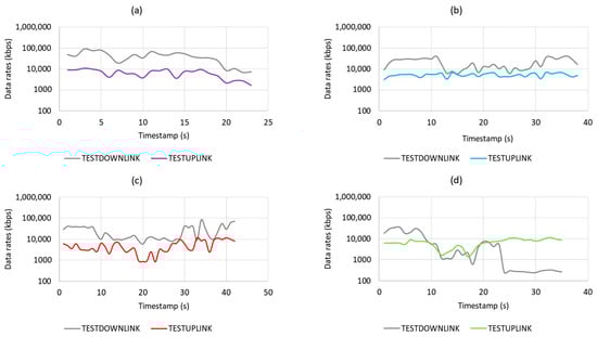 Data rates by different mobile network operator: (a) Umobile, (b) Celcom, (c) Maxis, and (d) Digi.