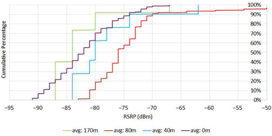 Figure 13 shows the cumulative distribution of RSRP at different elevations. By increasing the height, at first, the RSRP improved. According to (1)–(3), the main reason for this behavior is that by increasing height, the probability of LOS communications increases, resulting in lower pathloss. In addition, according to (5) and (6), when the drone altitude increases above the breakpoint pathloss is similar to the free space propagation. However, as the drone goes to higher altitudes (in this case 170 m), there is a significant loss in the RSRP signal level. By increasing altitude, the distance between the drone and eNodeB increases and results in larger pathloss and reduces the eNodeB antenna gain and receive power. In addition, since the eNodeB antennas are down tilted by increasing the height the probability of serving drones by mainlobes decreases. Therefore, at higher altitudes, drones will be served by the sidelobes of antennas, which results in lower antenna gain than the mainlobes of eNodeB antennas serving UEs at lower altitudes. However, the RSRP values are concentrated in −65 dBm and −85 dBm for different heights, which shows that coverage for drones at the measured altitudes is satisfactory.