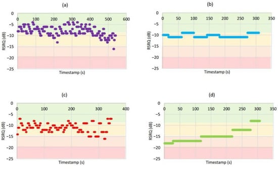 One of the major technological features of the UMTS Soft/Softer handover architecture was absent when the LTE system was developed. This is mainly due to the adjacent cell frequency reuse and orthogonality in LTE, and because the LTE system has a flat architecture []. Therefore an assumption was made that only hard handovers occur during the test. The UE’s signal quality was analyzed to see what happened during the handoff from one eNodeB to another eNodeB along the route during the drive test.