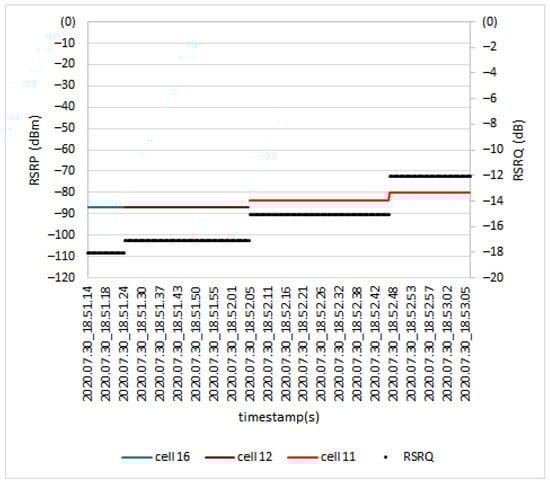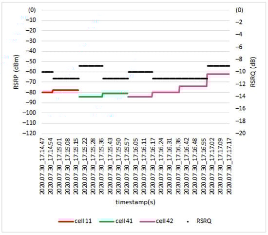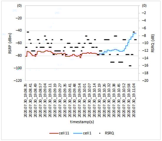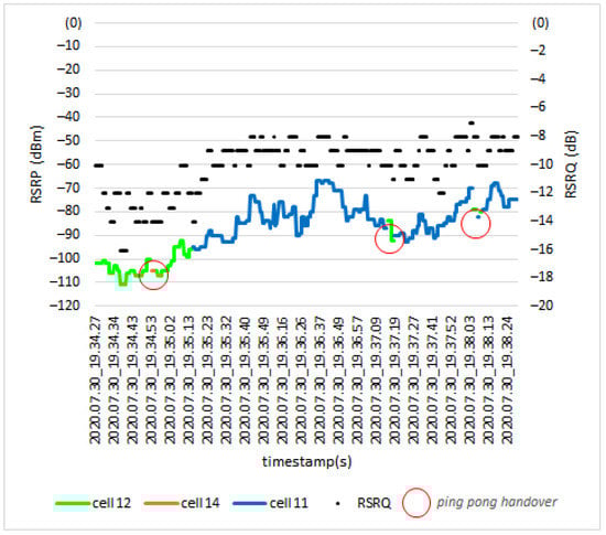Figure 16 shows the RSRP and RSRQ levels for a scenario where the terrestrial UE moved throughout the path. It can be seen from the results that in three points ping-pong handovers occurred (red circles). The ping-pong HO happens when a UE is handed over from one cell to another but quickly handed back to the original cell. During the drive test, the UE was served by two dominant cells: cell 12 and cell 11. When the link is handed from cell 12 to cell 11, the RSRP level changed from −96 dBm to −95 dBm, and the RSRQ level changed from −12 dB to −14 dB.