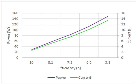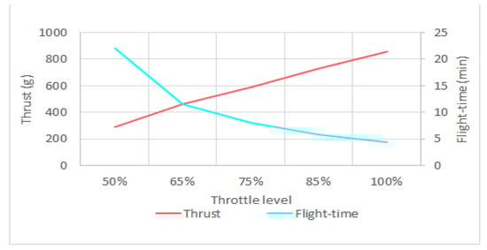 As can be seen in Figure 22, the drone’s power and current consumption are inversely related to efficiency. In other words, by further pushing the throttle, the rate of power consumption enhancement is more than the thrust enhancement and a larger part of the energy will be lost at higher throttle levels. Hence, as the throttle is pushed further, the drone’s flight time will decrease, as shown in Figure 23. Moreover, the results show that the energy consumption by control and telecommunications components is relatively high, compared to the energy consumed by the motors. Therefore, to enhance the drone’s flight time, not only should the drone weight, battery capacity, and throttle level be optimized, but also more energy-efficient components and algorithms should be developed for communications and flight control.