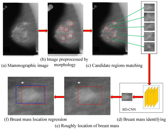 (2) The suspected regions of breast mass cropped from the mammographic image are classified as breast mass or background by BD-CNN. We realized the detection task for breast mass and obtain a better detection performance in the mammographic image via the mathematical morphology method, image template matching method and a classification network.