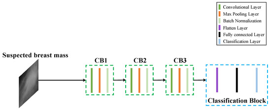 BD-CNN contains an input, output, three convolutional blocks (CB), a flatting layer, a fully connected layer and a classification layer. Each CB contains a convolutional layer, a max-pooling layer, a Batch Normalization (BN) [36] and ReLU activation function. There are 128 convolutional kernels in each CB, and the size of convolutional kernels used in CB1, CB2 and CB3 are 5 × 5, 3 × 3 and 3 × 3, respectively. BD-CNN receives the image of the suspected breast mass region, which is resized to 200 × 200 pixels from the input and generates the feature maps by three CBs. Then, these feature maps are flattened by a flatting layer and the discriminant features are further extracted by a fully connected layer containing 1024 nodes. Finally, the output of the fully connected layer is classified into breast mass and background categories by a classification layer with softmax.