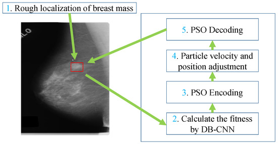 The suspected regions of breast mass generated by the mathematical morphology and the image template matching methods means that the bounding box of breast mass are rough. To solve the problem of the rough bounding box of breast mass in the mammographic image, the PSO algorithm is used to search a location and bounding box better to match the ground truth of the breast mass because it can exploit the potential solution by a global random research mechanism. The flow chart of breast mass bounding box regression conducted using PSO is shown in Figure 5. The rough bounding box of breast mass from the mammographic image is used as the initialization of the regression model. The BD-CNN is used as the fitness function of PSO to predict the probability that the region is a breast mass, and the region is optimized by the PSO based on the probability. PSO Encoding encodes the bounding box of breast mass on the mammographic image into a particle feature, i.e., the center coordinate x and y, width and height. PSO Decoding transforms the particle feature into the bounding box of a breast mass on the mammographic image. Steps 2 to 5 are the iterative optimization processes for the regression of the breast mass bounding box in the mammographic image.