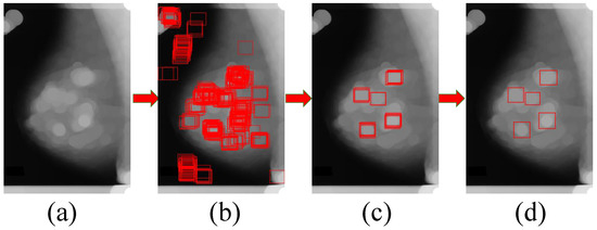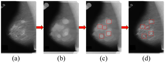 After obtaining the circular regions in the processed image by the mathematical morphology and image template matching methods, we crop the suspected regions of breast mass from the mammographic image. As shown in Figure 8, we match these regions using the image template matching method with an ellipse dilating kernel with a size of 50 × 50 pixels. The regions enclosed by the red rectangles in the image (d) are the suspected regions of breast mass.