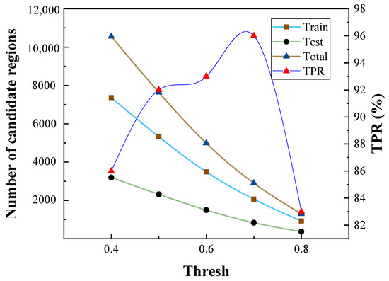 Different thresholds of the image template matching cause different numbers of suspected regions and have a great influence on the detection results. As shown in Figure 9, when the threshold is 0.4, there are 10,552 suspected regions cropped from mammographic images. The threshold is set to 0.7 in this paper and there are 2065 suspected regions (i.e., 307 breast masses and 1758 background) that are used as the training dataset and 836 suspected regions (i.e., 132 breast masses and 704 background) that are used as the test dataset. The experimental results of the proposed method and the state-of-the-art detection methods for the mammographic image are listed in Table 1 and Figure 10. Compared with traditional breast mass classification methods, deep learning can automatically extract discriminative features from mammographic images and avoid the problem of poor discriminative ability of features using the manual design feature extraction method. We cited the experimental results in the works of literatures for Eltonsy [26], Sampat [37], Wu [38], Junior [39], Liu [40] and Cao [41] in Table 1. RetinaNet [42], FSAF [43], Foveabox [44] and our method in Table 1 are evaluated on the subset used in this paper. The benefit from the proposed method simulates the breast mass detection process of radiologists via the multi-stage method, meaning it can detect the breast mass in a more intelligent way. The proposed method achieves the highest True Positive Rate (TPR) and the lowest False positives Per Image (FPI), performing better than all of the compared breast mass detection methods.