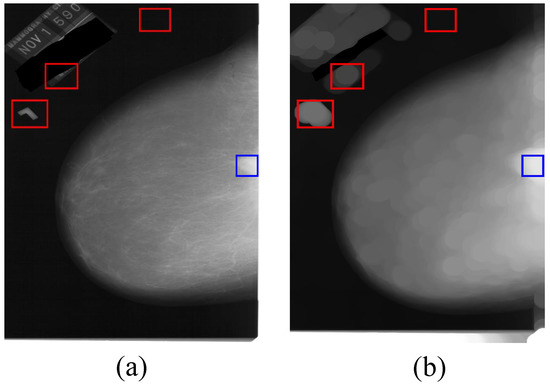 Some of the regions of breast mass cannot be matched in the mammographic image due to the fact that they are not circular regions and the image template matching method is hard to match the non-circular region by our proposed image template. As shown in Figure 11, the red rectangles in (a) and (b) are the matched regions, the blue rectangles are the ground truth of the breast mass. The image template matching method does not match the breast mass because the shape of the breast mass in the processed image is not an ellipse.