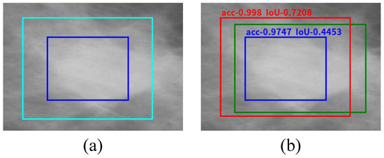 For attaining a better probability of breast mass detection by BD-CNN, we use PSO to optimize and search the feasible resolution. As shown in Figure 13, the blue rectangles in image (a) and image (b) are the rough bounding boxes generated by the image template matching method from the processed image. The cyan rectangle in image (a) is the search range for the effective resolution by PSO. The cyan rectangle is expanded from the rough bounding box with a blue color. In particular, the cyan rectangle is 30% of the height of the upward and downward expansion, and 30% of the width of left and right expansion. The green rectangle in image (b) is the ground truth of breast mass, and the red rectangle is the optimal matching result regressed using PSO. Image (b) illustrates that the bounding box of breast mass can be refined and a higher IoU can be achieved using PSO.