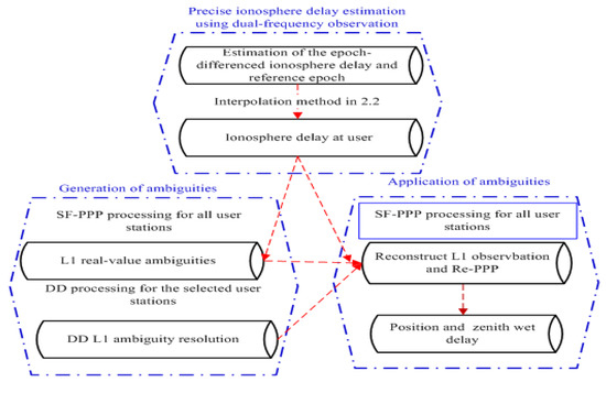 where the term of is the SD real-value L1 ambiguity at user u, is the DD integer ambiguity formed with the two users of r and u. For the determination of the best performance and the selection of the high-quality SD real-value L1 ambiguity, the ratio values in the DD processing can be used [6]. Equation (11) shows the ambiguity at user has the integer characteristic and can be fixed. The generated ambiguity in Equation (11) is obtained using the DD observation formed by the users u and r. Figure 1 indicates the flowchart for the estimation and interpolation of the precise ionosphere delay and the introduction of the DD ambiguity into SF-PPP. The SF-PPP processing for all users is carried out, and the corresponding SD float ambiguity is obtained at first. Then, the DD ambiguity is generated as shown in Equation (11), and the ambiguity processing for the SF-PPP is converted into DD ambiguity processing, which is formed with the users of a and b. When this DD ambiguity is fixed and then introduced into the SF-PPP processing for the user a or b, the fixed SF-PPP ambiguity is realized.