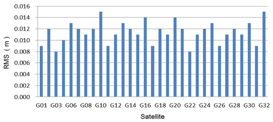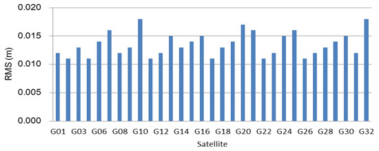 The interpolated ionosphere delay was obtained using the proposed method in Section 2.2, and its performance was evaluated. Firstly, the reference epoch-based ionosphere delay was computed according to Equation (7). The RMSs of the difference between the interpolated ionosphere delay and the estimated values for all the satellites were computed and shown in Figure 3 and Figure 4. From Figure 3, it is observed that the accuracies of the interpolated ionosphere delay for all tracked satellites at the reference epoch are better than 2 cm, and the accuracies for most of the satellites reach 1.5 cm. Figure 4 shows that the time-varying interpolated ionosphere delay was better than the 1.6 cm, and the accuracies of most satellites were better than 1.2 cm. The interpolated ionosphere delay could be used to realize the SF-PPP.