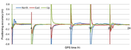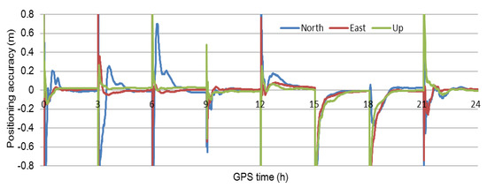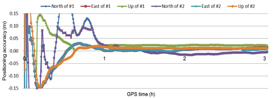 It is well known that ambiguity fixing is beneficial for improving positioning accuracy. Generally, the FCB needs to be estimated and serviced in PPP ambiguity fixing. In Li et al. [6] and Odijk et al. [29], the DD ambiguity resolution [44,45] was introduced into PPP to realize PPP ambiguity fixing. This method avoids the complicated procedure of the FCB estimation. In SF-PPP fixing, the DD and PPP ambiguity resolutions are mutually employed. Here, during data processing, the realization of the SF-PPP ambiguity fixing was based on the DD ambiguity resolution. The quality of the SF-PPP float ambiguity result was very important in this processing. In fact, the application of the SF-PPP float ambiguity result was to cancel the effect of the FCB of the SF-PPP. The results of the user CMMZ for the methods of #1 and #2 are shown in Figure 7. Obviously, the result of the first 3 h session for method #2 was better than that of method #1 and the corresponding convergence time was shorter than that of method #1. The improved positioning accuracy and convergence time for all user stations and sessions are shown in Table 4. From Table 4, it can be seen that the mean improvement of the positioning accuracy in North, East, and Up directions were 0.63, 0.62, and 0.91 cm, respectively. The average convergence time for all user stations and sessions was 1.5 min. The improved accuracy and the convergence time validate that the introduction of the DD ambiguity resolutions into SF-PPP was meaningful for improving the performance of the SF-PPP. The accuracy improvement of the introduction of the DD ambiguity resolutions into SF-PPP could further improve the deformation monitoring ability of the SF-PPP.