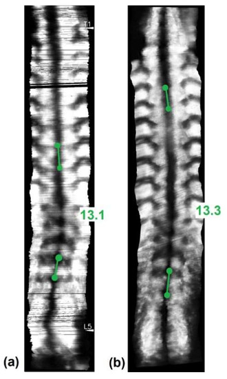 Coronal ultrasound images formed using the skin surface curve VPI method with SPA measurement on (a) Scolioscan Air and (b) Scolioscan.