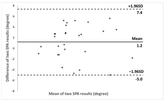 The mean absolute difference between the SPA obtained by the two 3D ultrasound systems was 2.9 ± 1.8 degrees, with the maximum value of 5.6 degrees for one case. The Bland-Altman plot showed a small mean difference of 1.2 degrees and the differences were symmetrically distributed around the mean difference, and overall the two sets of SPA values agreed very well (Figure 8).
