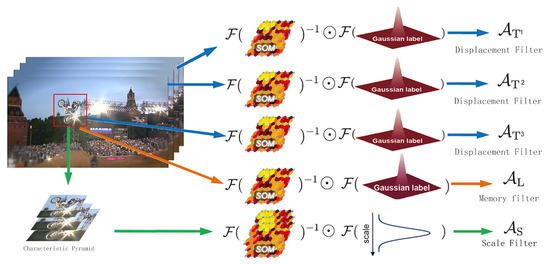 The goal of the object tracking algorithm proposed in this paper is to use SOM and multiple correlation filters to deal with the following challenges in the visual tracking process: (1) the obvious changes in appearance over time; (2) changes in scale; (3) recover the goal from the tracking failure. First, the existing algorithms based on a single correlation filter [23] cannot achieve these goals, because it is tough to strike a balance between stability and adaptability using one filter only. Secondly, although a lot of works have been done to solve the challenge of scale prediction [17,24,44], it is still an unresolved problem because the slight error of scale estimation will cause rapid degradation of the appearance model. Third, it is still a challenge to determine when the tracking failure occurs and to re-detect and track the target from the failure. In the algorithm proposed in this paper, we use three different levels of displacement filters, a scale filter and a memory filter to solve these problems. Figure 2 shows the construction of a correlation filter for visual tracking. The displacement filters and are used to model and estimate different forms of targets, respectively, the scale filter is used to evaluate the scale estimation of the tracked object, and the long-time memory filter is used to keep the long-time memory of the appearance of target to estimate the confidence level of every tracking result.