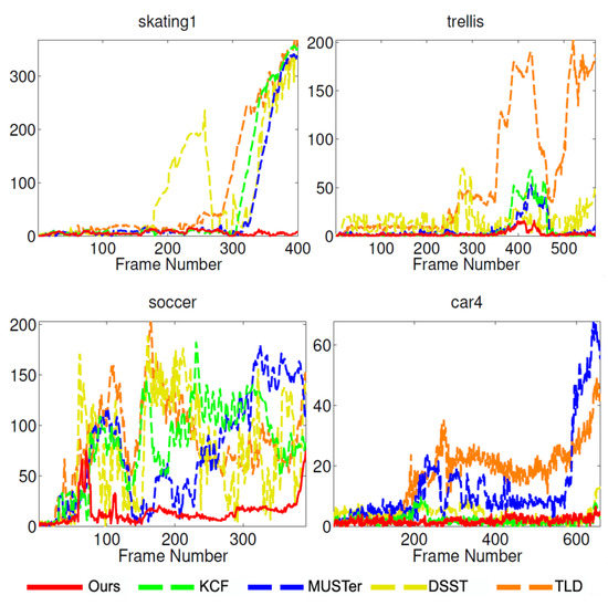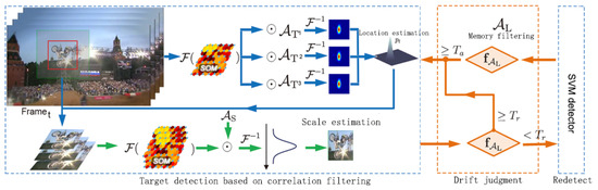 where t is the index of the image frame, and is the learning rate. This method updates the position filter every frame, emphasizing the importance of model adaptation and short-time memory of target appearance, but only one of the three position filters is updated each time. The selection of these three filters is a circular selection method. Since this scheme is very effective in dealing with appearance changes, the tracking algorithm [6,17] has achieved good performance in recent benchmark studies [38,46]. However, when the training samples are noisy, these trackers are prone to drift and cannot recover from tracking failures due to the lack of long-time memory of the appearance of the target. The update scheme in Equations (21) and (22) assumes that the tracking result of each frame is sufficiently reliable, so it is natural to use the training sample to update the correlation filter. This is not correct in a complex scene, the result of such an operation is easy to send tracking drift. To solve this problem, we proposed to create a long-time memory filter to preserve the appearance of the target. In order to maintain the stability of object tracking, we set a threshold to conditionally update the long-time memory filter. Only when the target’s confidence is greater than this threshold do we update the long-time memory filter. The proposed algorithm uses the maximum value of the correlation response map as the confidence score, because it reflects the similarity between the tracked object and the learning template in the long-time memory correlation filter. Compared with the long-time memory method [55,56] that only uses the first frame as the target appearance, we conditionally update the long-time memory filter to improve its adaptive ability. This allows the long-time memory filter to adapt to a certain degree of time-varying target appearance.