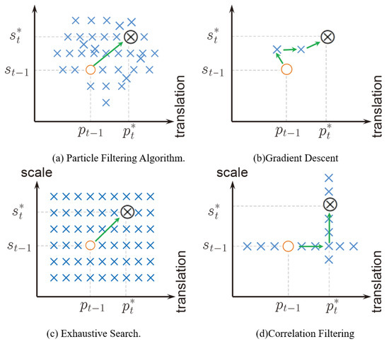 The particle filter-based tracking algorithm [51] uses random samples to approximate the target state distribution including position and scale changes, as shown in Figure 4a. Gradient descent methods (such as Lucas-Kanade [52]) iteratively infer local optimal positions and scale changes (see Figure 4b). The object tracking algorithm based on correlation filter [23] decomposes the tracking task into two independent subtasks (position and scale estimation) demonstrated in Figure 4d, which not only reduces the burden of intensive estimation of the target state, but also avoids the noise update of the displacement filter under the circumstance inaccurate scale estimation. Experimental results (see Ablation Study Section). show that the performance of our tracker is significantly better than another implementation (CT-JOP), which uses the estimated scale change to update the displacement filter.