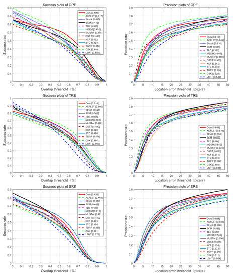 Regarding the TRE and SRE evaluation schemes, the method proposed in this paper cannot get good performance in the OPE evaluation. This is because the TRE and SRE evaluation programs do not fully show the strengths of the methods we propose. The setting of TRE decomposes a video sequence into several segments, so the re-detection importance in long-time tracking is ignored. SRE initializes the tracker with wrong target position and scale. Since our tracker depends on correlation filter training to distinguish the object from the background, inaccurate spatial information of initialization will have a negative impact on the performance of the filter’s target positioning.