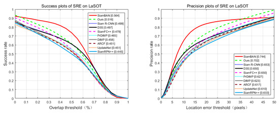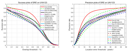 We also evaluated our algorithm, SiamBAN [15], SiamR-CNN [60], D3S [59], SiamFC++ [64], PrDiMP [61], DiMP [62], ARCF [65], UpdateNet [66] and SiamRPN++ [67] in the UAV123 [41] and LaSOT [42] datasets. Figure 8 and Figure 9 show the success plots of spatial robustness evaluation (SRE) for each tracker. In LaSOT, the success and precision of our method rank second, and SiamBAN achieves the highest level. However, in UAV123, our method reaches the highest value.
