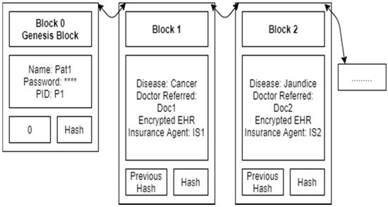 Figure 2 shows the Patient Pat1 blockchain. It contains the patient’s name, password and patient ID in the genesis block. Details of each disease treatment (encrypted EHR, a hash with a bilinear map) are added as a new block, one by one. Here the patient can only see his details, and no one else can see the details.