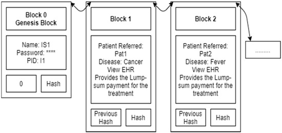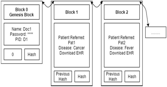Figure 3 shows the Doctor Doc1 blockchain. It contains the doctor’s name, password and doctor ID in the genesis block. Details of each disease treatment (encrypted EHR, a hash with a bilinear map) are added as a new block, one by one. A doctor can view only permission-granted patient blocks.