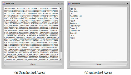 Figure 5a shows the unauthorized user cannot access EHR, and Figure 5b shows the authorized user can access EHR. The outcome of the examined access control shows that BSF-EHR attains safe information distribution between customers. Most importantly, the BSF-EHR access control system is capable of protecting important EHRs against external attacks.