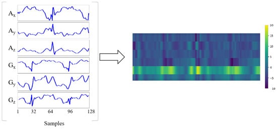 One input sample. Ax, Ay, Az are the 3-axis acceleration data, and Gx, Gy, Gz are the 3-axis angular velocity data. The 6-axis sensor data are combined into a matrix with the shape of 6 × 128.